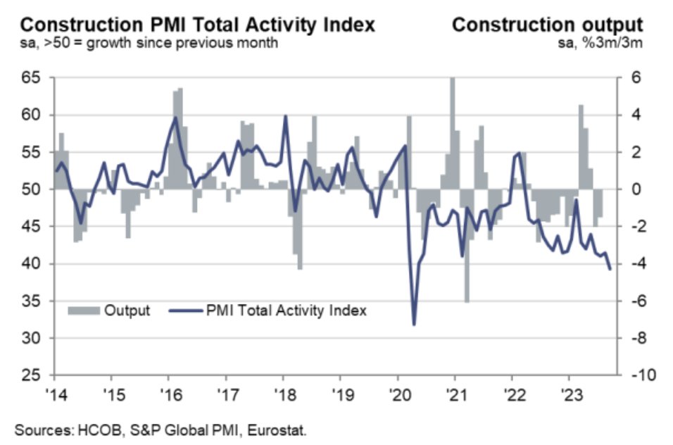 Germany Construction PMI #chartoftheday (via @disclosetv) Germany’s construction sector continued to deteriorate in September. Construction PMI falls from August’s 41.5 to 39.3 amid a near-record drop in new orders.