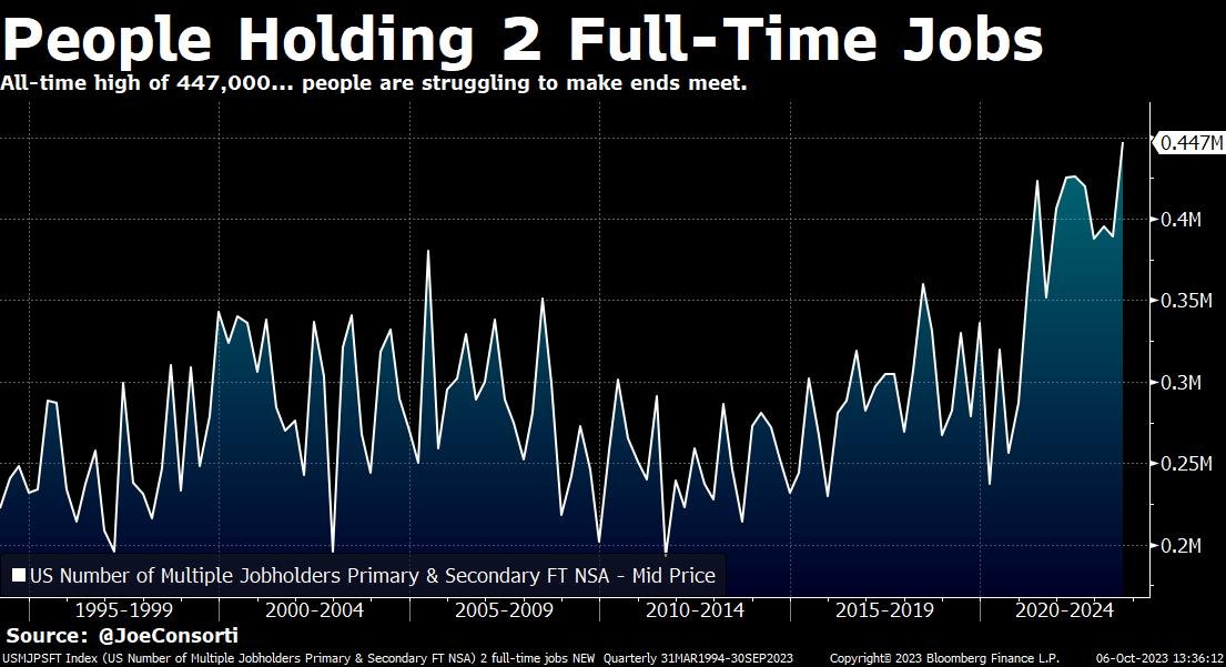 US Employment #chartoftheday (via @KobeissiLetter + @JoeConsorti) A record 447,000 Americans are now working 2 full-time jobs, 33% higher than it was in 2008. Meanwhile, part-time employment has jumped by nearly 1.2 million since June.