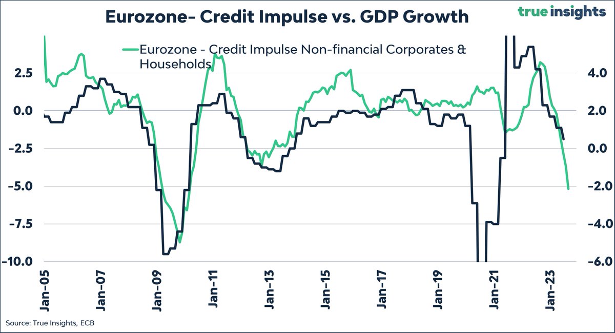Eurozone – Credit Impulse vs GDP Growth #chartoftheday (via @jsblokland) The Credit Impulse – the change in loan growth (accelerating or slowing) relative to GDP – is dropping precipitously, only looking worse during the GFC