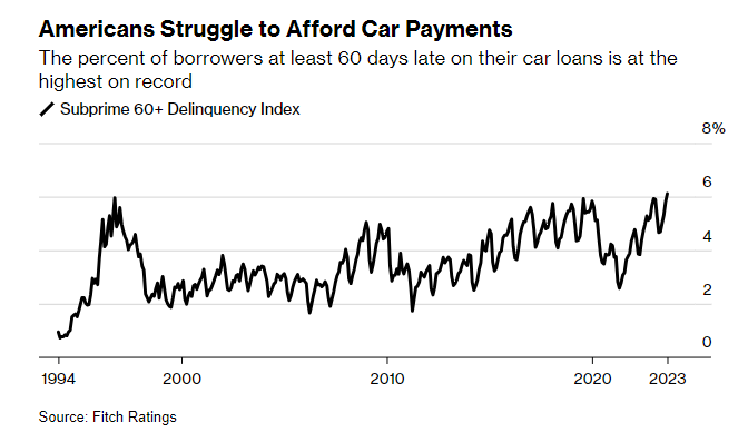 US Borrowers Late on Car Loans At Highest Rate #chartoftheday (via @chigrl) The percent of subprime auto borrowers at least 60 days past due on their loans rose to 6.11% in September, the highest in data going back to 1994, according to Fitch Ratings.