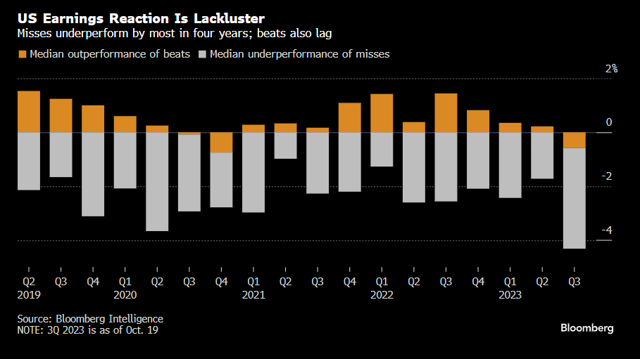 US Earnings Reaction is Lackluster #chartoftheday (via @lisaabramowicz1) Bloomberg Intelligence shows that the median underperformance of shares of US firms that miss profit estimates in 3Q2023 is the most in four years.