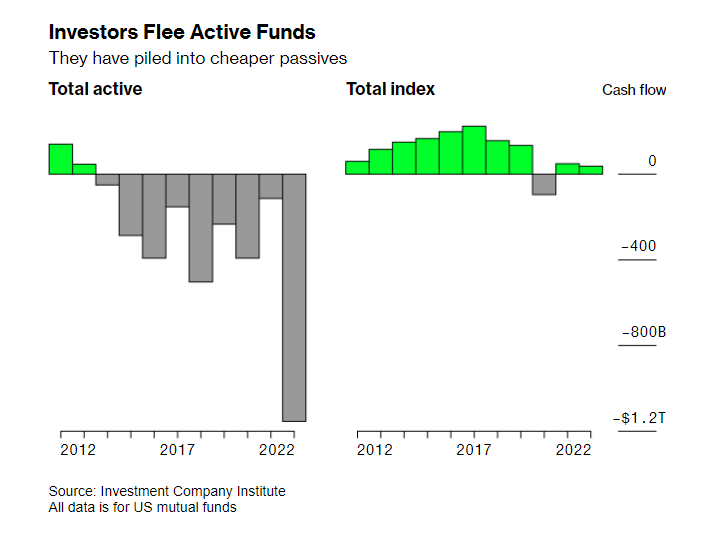 Investors Continue to Flee Active Funds #chartoftheday (via @acemaxx) From Bloomberg about the $10tn asset management industry: “The unprecedented run of bull markets that buoyed their investments and masked life-threatening vulnerabilities may be a thing of the past.”