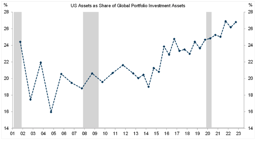 US Assets as % of Global Portfolio Assets #chartoftheday (via @dailychartbook) This chart from Goldman Sachs shows global ex-US positioning in US portfolio assets (equities + bonds) at 27% of global positioning.