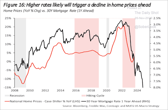 Rates to Trigger Decline in Home Prices Ahead? #chartoftheday (via @dailychartbook) Data from MUFG shows there is a one-year lag between changes in interest rates and changes in home prices, suggesting home prices might correct in 2024.