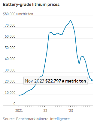 Battery-grade Lithium Prices #chartoftheday (via @charliebilello) Battery-grade lithium prices are down over 70% from their peak in January as a result of weaker EV demand and the slowdown in China.