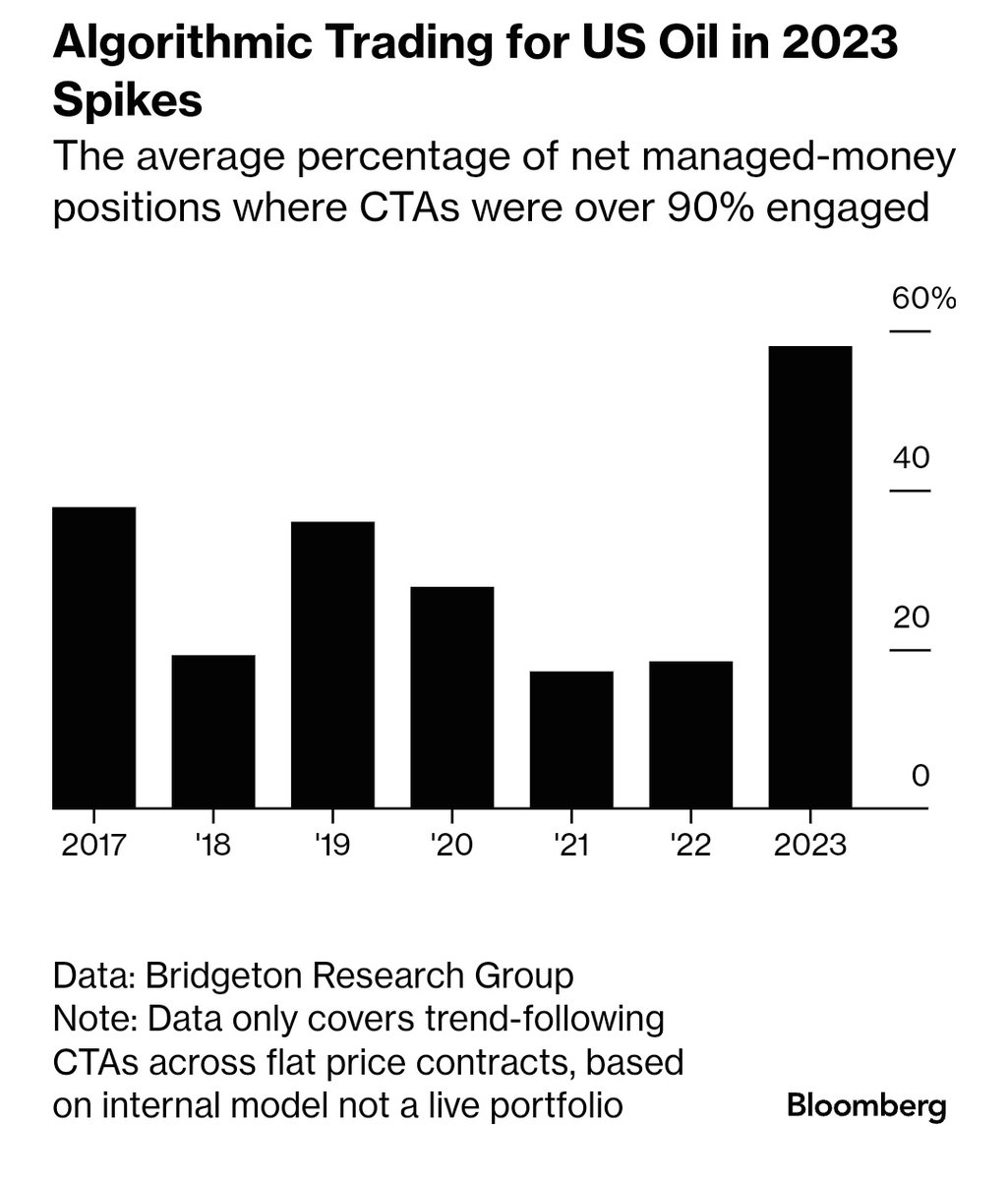 Algorthmic Trading for US Oil in 2023 Spikes #chartoftheday (via @chigrl) Algos are probably responsible for as much as 70% of crude trades on an average day, according to data from TD Bank and JPM.