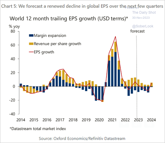 World 12m Trailing EPS Growth #chartoftheday (via @dailychartbook) “Oxford Economics expects declines in global corporate earnings due to slowing revenue growth and falling margins.”