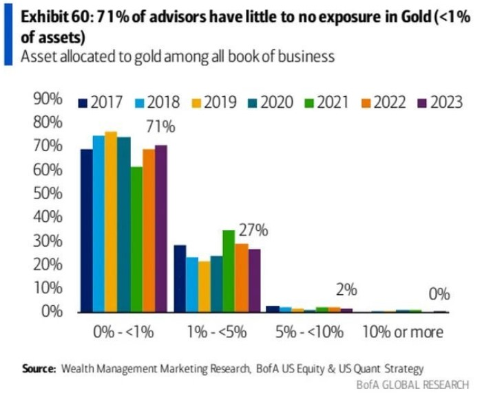 US Advisors Have Little to No Gold Exposure #chartoftheday (via @jsblokland) With gold near all-time highs, this chart from BofA shows that 71% of US financial advisors have <1% exposure to gold.