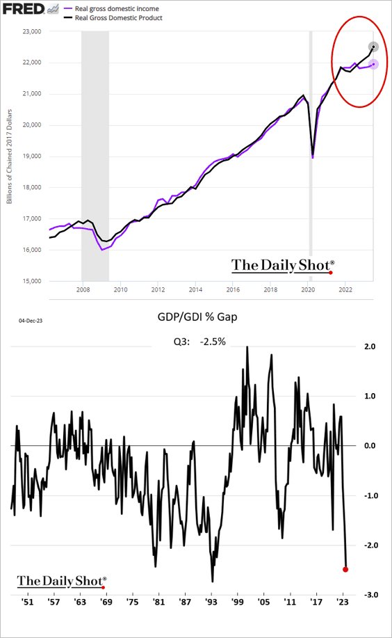 US GDP-GDI Divergence at Extreme Levels #chartoftheday (via @SoberLook) The gap between US GDP and GDI has reached 2.5%, levels not seen since 1993, which might suggest the US economy may not be as strong as the GDP numbers imply.