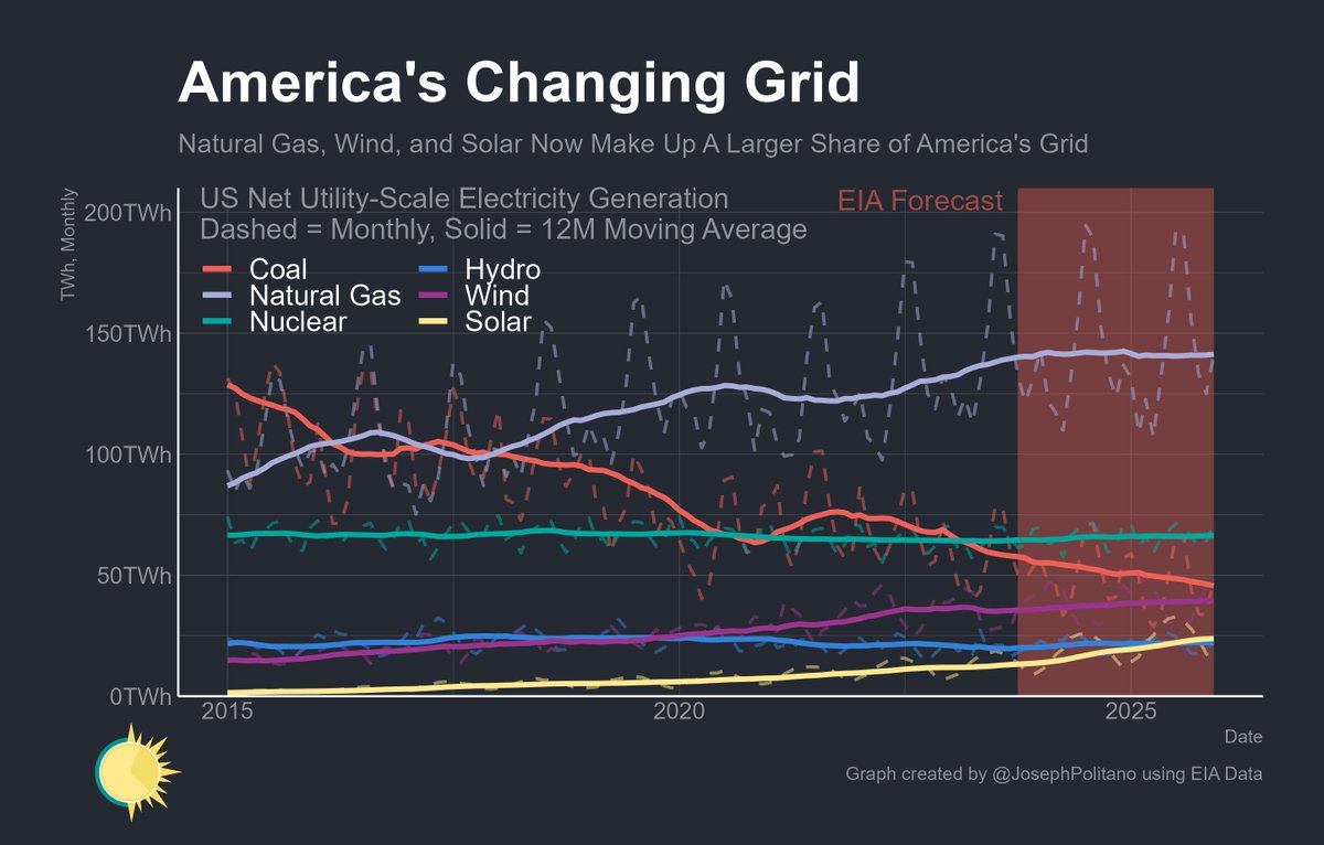 America’s Changing Grid #chartoftheday (via @JosephPolitano) The US Energy Information Administration expects clean energy to make up a record 45% of electricity due to continued growth of solar/wind and rapid decline of coal in 2025.