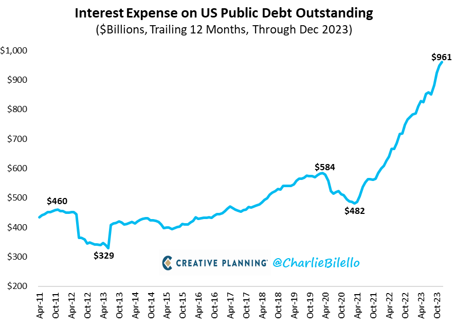 Interest Expense on US Public Debt #chartoftheday (via @charliebilello) The interest expense on US public debt has risen to $961bn, a record high. If it continues at the current pace, it will replace Social Security as the largest line item in the Federal budget soon.