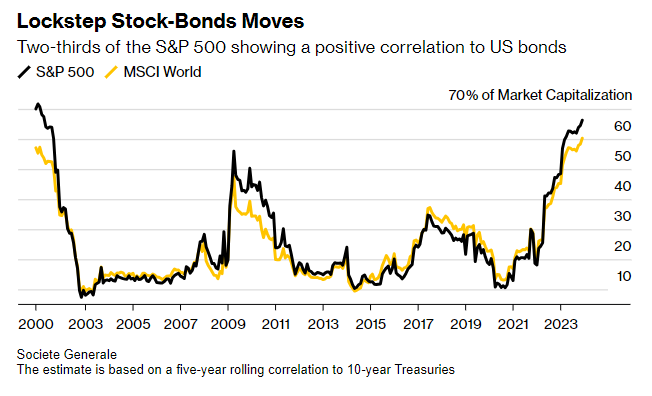 Stock-Bond Correlation Remains High #chartoftheday (via @Barchart) Two-thirds of S&P500 stocks are showing a positive correlation to US 10y treasuries, the most since 2001.