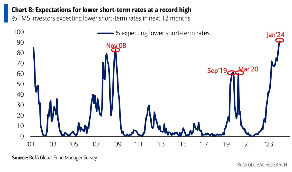 Expectation for Lower Short-term Rates at Record #chartoftheday (via @RobinWigg) 90+% of investors in BofA Global Fund Manager Survey expect lower rates in the next 12 months, a record high.