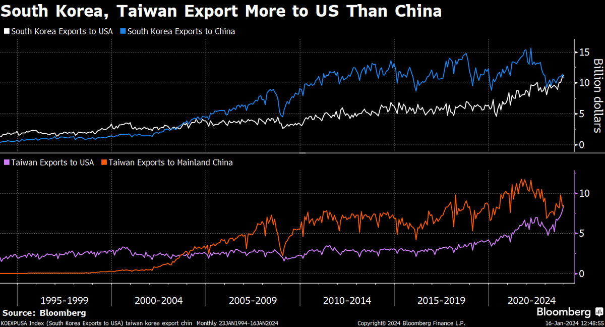 SKorea, Taiwan Export More to US Than China #chartoftheday (via @xieyebloomberg) South Korea and Taiwan’s exports to US surpassed that to China for the first time since China joined the WTO in the early 2000s.