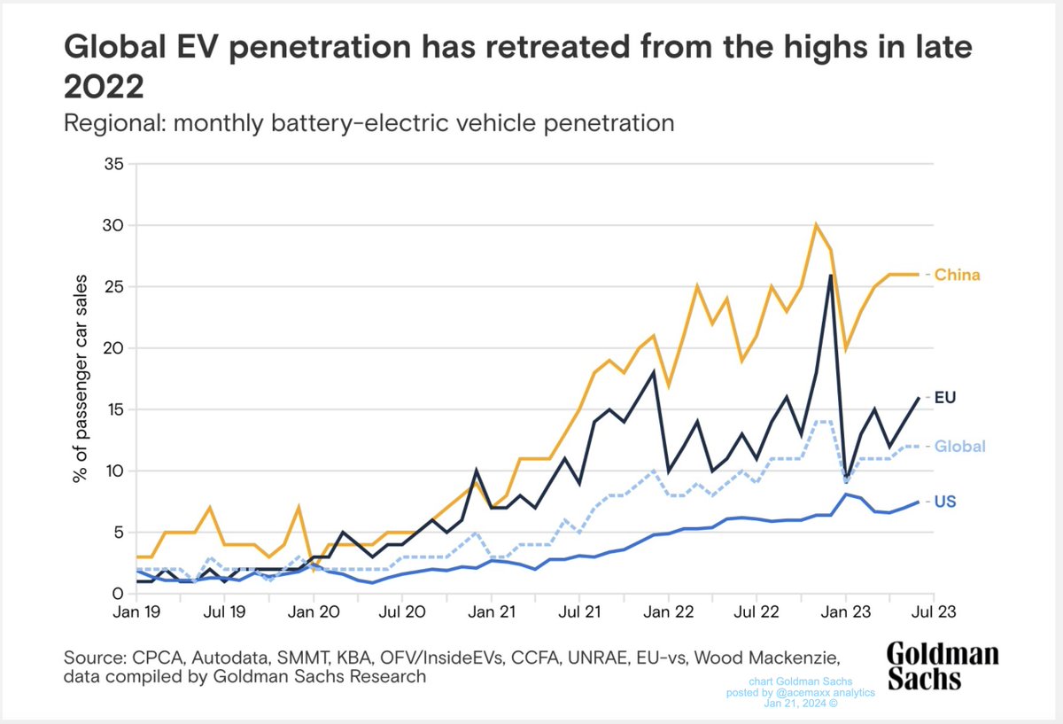 EV Penetration Retreats #chartoftheday (via @acemaxx) A cutback in EV subsidies in Europe and China has seen global EV penetration decline from highs seen in 2022.
