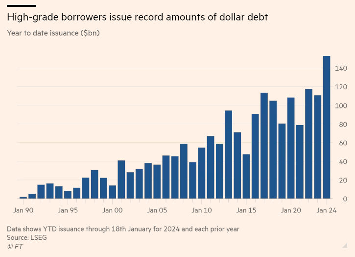 IG Corporate Borrowing Hits Highs #chartoftheday (via @Barchart) Investment-grade companies issued more than $150bn in bonds in the first 18 days of the year, the highest amount up to that point in the year in history.