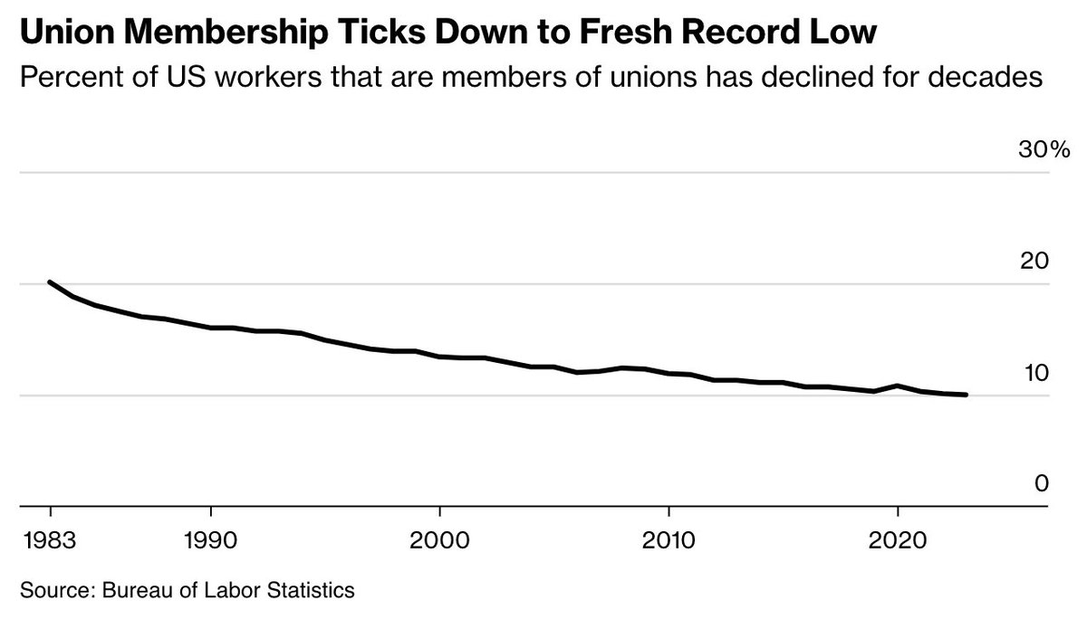 US Union Membership Ticks to Record Low #chartoftheday (via @dailychartbook) “US union membership hit a record low in 2023, even as labor capitalized on high-profile talks with automakers and actors and won the biggest raises in years.