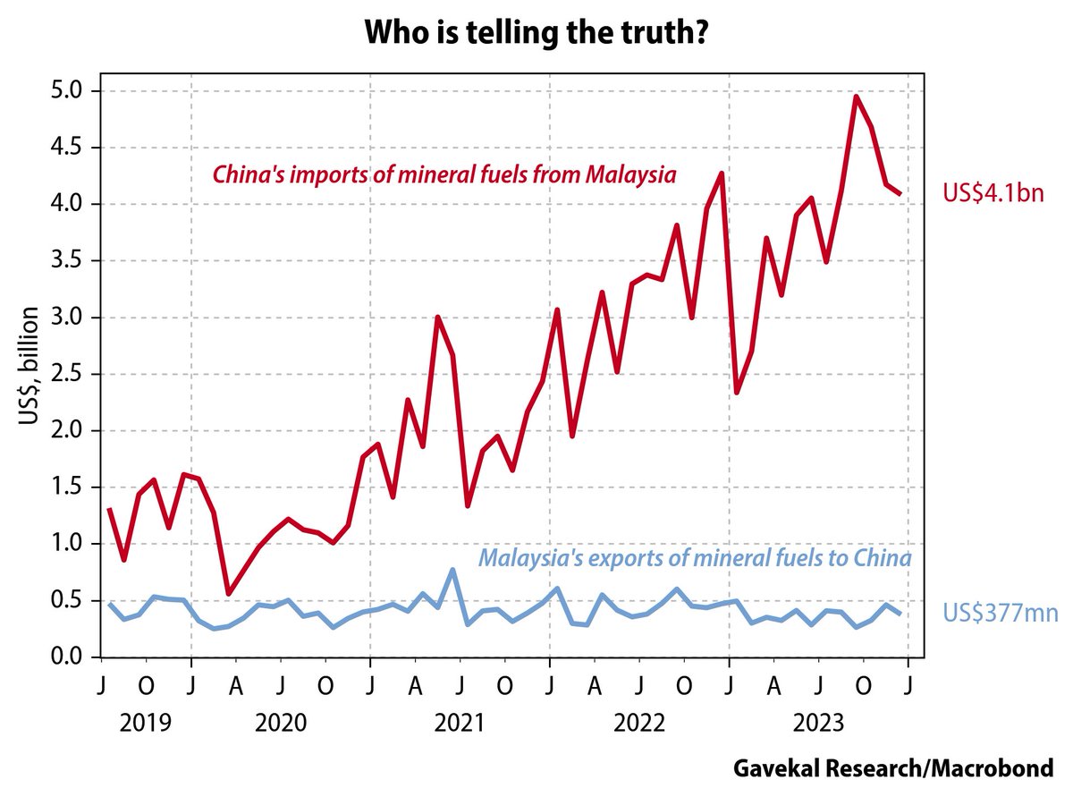 China – Malaysia Data Mismatch? #chartoftheday (via @Gavekal) China’s customs authority reported imports of mineral fuels from Malaysia worth US$4bn, more than 10x what Malaysia’s statistics office says it exported to China.