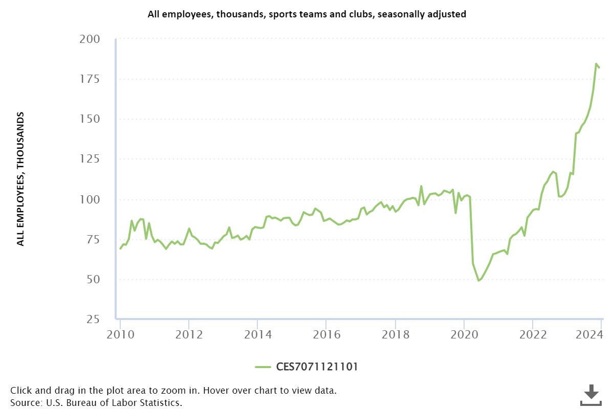 US Sports Teams Employees #chartoftheday (via @JosephPolitano) There has been a 75% increase in the number of employees at US sports teams and clubs over the past year.