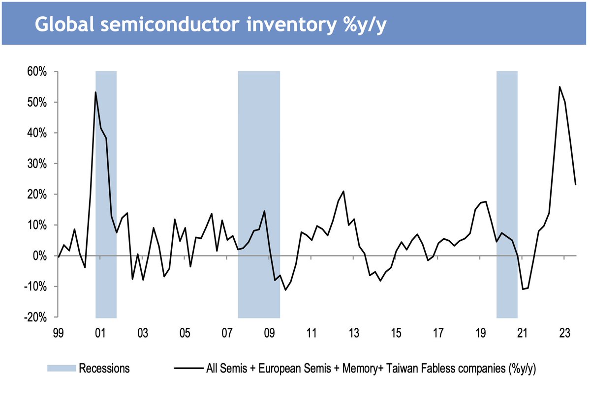Global Semiconductor Inventory Receding #chartoftheday (via @dailychartbook) JPM shows that semiconductor inventory levels remain extreme, and destocking over the coming quarters could put pressure on demand and lead to weaker pricing and margins for the sector.