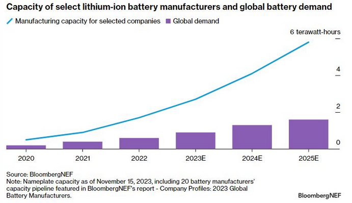 Li-ion Battery Capacity vs Demand #chartoftheday (via @Beth_Kindig) Lithium ion battery nameplate capacity is expected to further outpace demand in 2024 and 2025, with capacity reaching ~6TWh versus demand <2TWh.