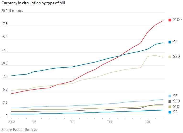 US Currency Bills in Circulation #chartoftheday (via @charliebilello) The number of $100 bills in the US has more than doubled over the last 10 years, faster growth than any other denomination.