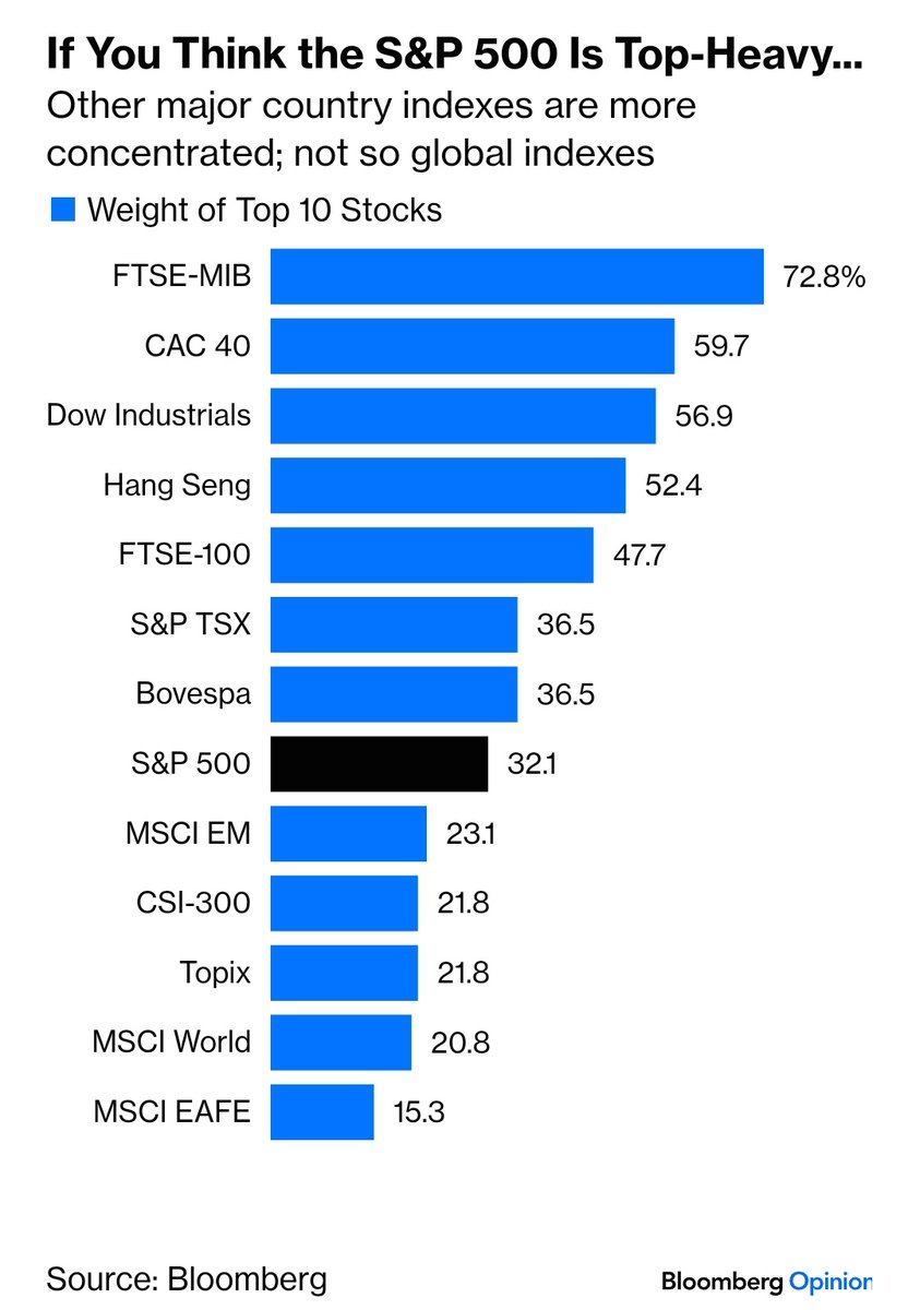 If You Think the S&P500 is Top-Heavy #chartoftheday (via @chigrl) Data compiled by Bloomberg shows that major country indices like in Italy, France and Canada have a higher concentration of weights in the top 10 stocks than does the S&P500.