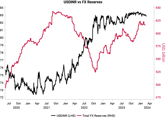 USDINR Remains Pinned #chartoftheday (via @VrntPerception) Foreign inflows into Indian assets have not led to an appreciation of the Indian Rupee, with the RBI keeping USDINR pinned and allowing FX reserves to accumulate.