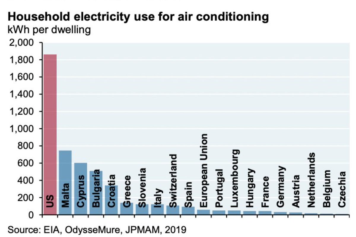 Household Electricity Use for Airconditioning #chartoftheday (via @JosephPolitano) European households’ use of electricity for airconditioning is several multiples less than that of American households.