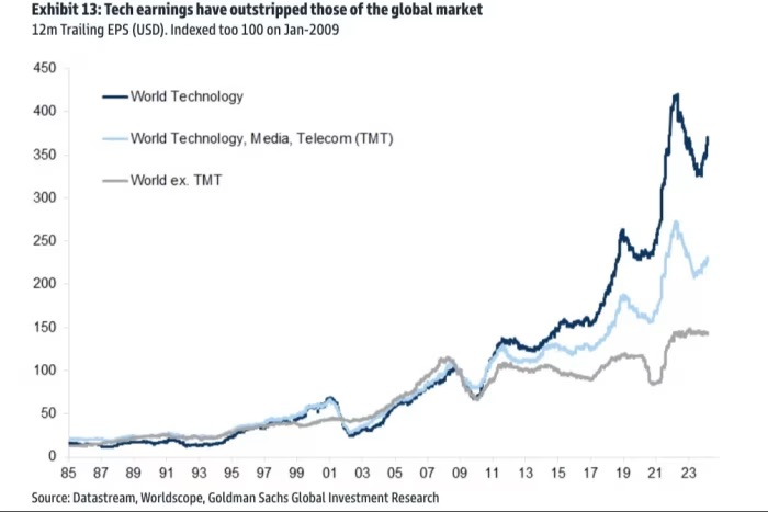 Tech Earnings Outstrip Those of the Global Market #chartoftheday (via @RobinWigg) Data compiled by Goldman Sachs Investment Research shows global technology companies’ earnings have signficantly exceeded that of companies in other sectors.
