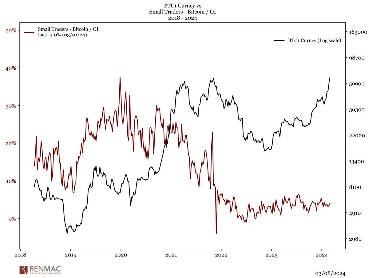 Small Traders not Driving BTC Up #chartoftheday (via @dailychartbook) Renaissance Macro: “Small speculators are not behind the parabolic rise in Bitcoin. Their positioning as a % of open interest has been stable.”