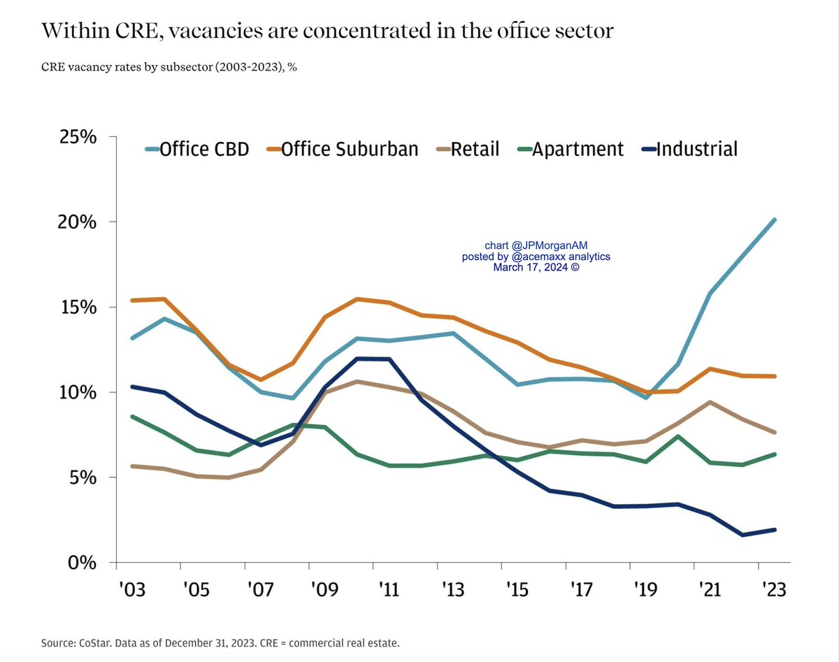 US Offices in CBDs Seeing Vacancies #chartoftheday (via @acemaxx) A chart compiled by JP Morgan Asset Management shows that within the commercial real estate sector, vacancies are concentrated in the office sector.