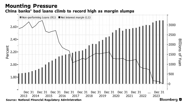 Mounting Pressure for Chinese Banks? #chartoftheday (via @Barchart) Non-performing loans at Chinese banks have risen to record highs, even as their net interest margin continues to slump, per Bloomberg.