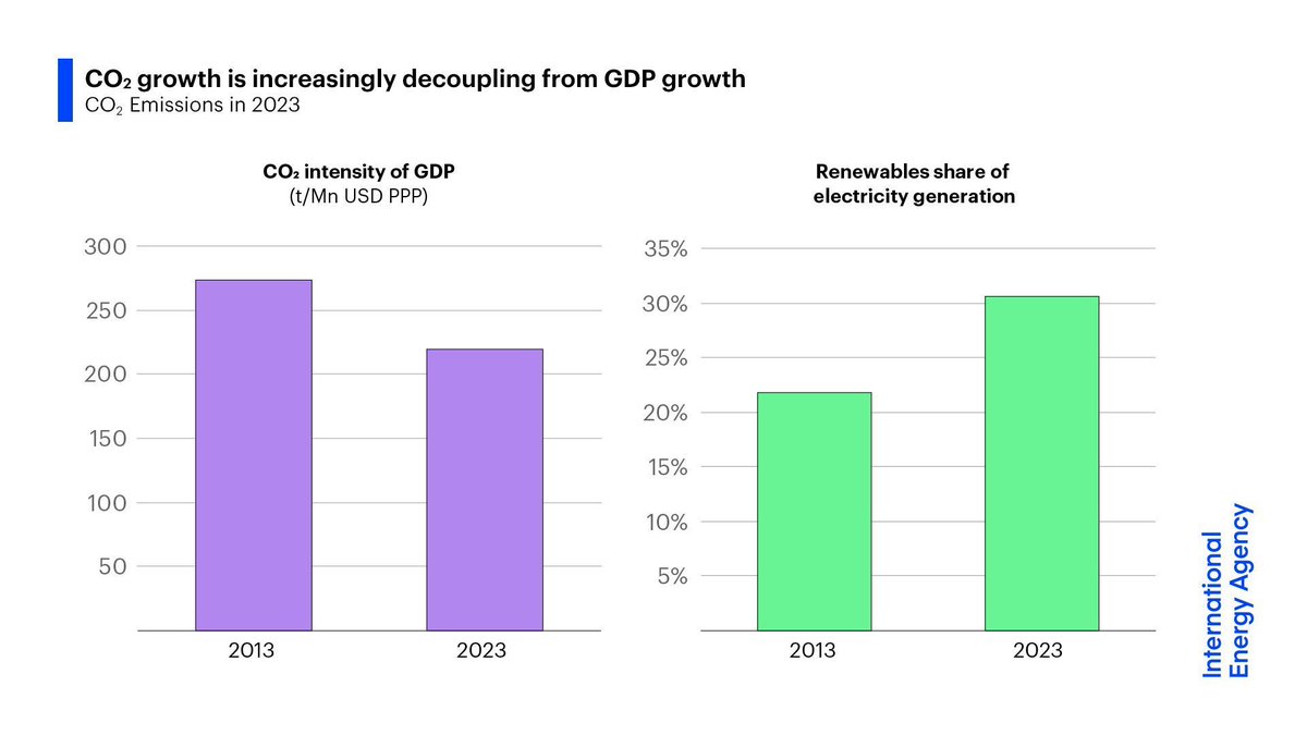 CO2 vs GDP Growth #chartoftheday (via @IEA) IEA data shows that over the last decade, the CO2 intensity of global GDP has fallen 20% thanks to the growth of renewables and the decline in emissions intensity of energy supply.