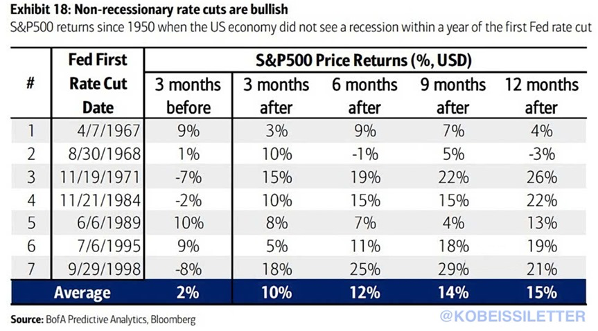 Non-recessionary Rate Cuts are Bullish #chartoftheday (via @KobeissiLetter) Since 1950, if the US economy did not experience a recession within a year of the first Fed cut, the S&P 500 was always up 3 and 9 months after.