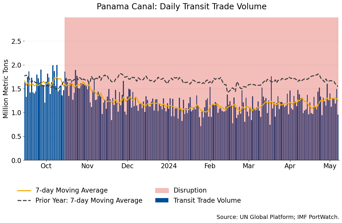 Panama Canal Trade Volume #chartoftheday (via @IMFNews) Shipping volume through the Panama Canal was down about 30% in the first four months of 2024 compared to last year due to drought-related restrictions, IMF PortWatch data shows.