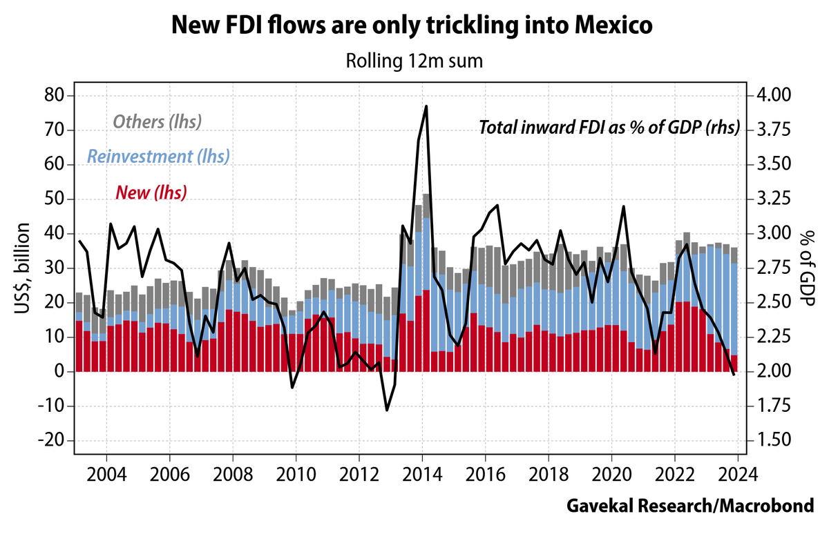Mexico FDI Flows #chartoftheday (via @Gavekal) “In absolute terms, the US$36bn in FDI Mexico attracted last year was on par with Vietnam, an economy one-third its size.”