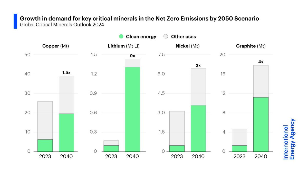 Growth in Demand for Key Critical Minerals #chartoftheday (via @IEA) The IEA projects a rapid increase in demand for some critical minerals like Lithium (9x) and Graphite (4x) in their Net Zero Emissions by 2050 Scenario.