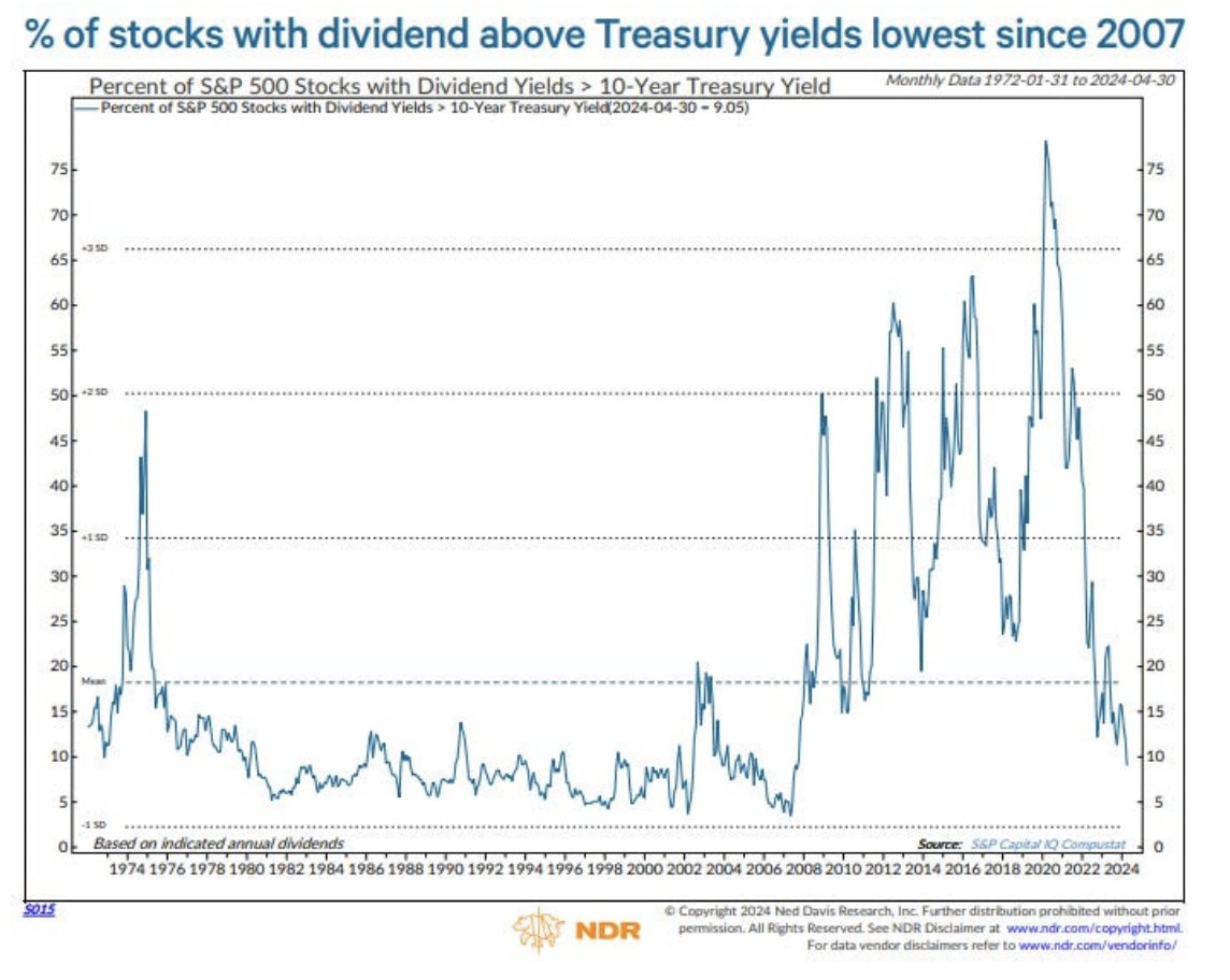 % of Stocks with Dividend > Treasury Yield #chartoftheday (via @Barchart) “The % of S&P 500 stocks with Dividend yields above the 10-Year Treasury yield has dropped to 9.1%, the lowest level since 2007”.