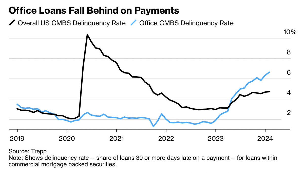 US Office Loans Fall Behind on Payments #chartoftheday (via @Barchart) The US Office CMBS Delinquency Rate continues to inch higher, suggesting all might not be well in the sector.