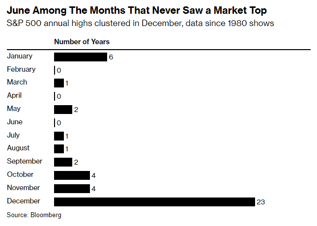 S&P500 Hasn’t Topped in June in 44 Years #chartoftheday (via @Barchart) Data compiled by Bloomberg since 1980 shows that June is among the months that has never seen a market top in a calendar year.