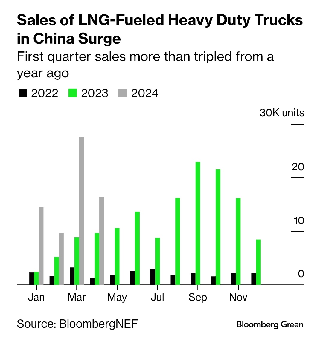 Sales of LNG-Fueled Trucks in China #chartoftheday (via @chigrl) One in three new heavy-duty trucks sold in China in April was powered by LNG, up from just one in eight a year earlier, according to BloombergNEF.