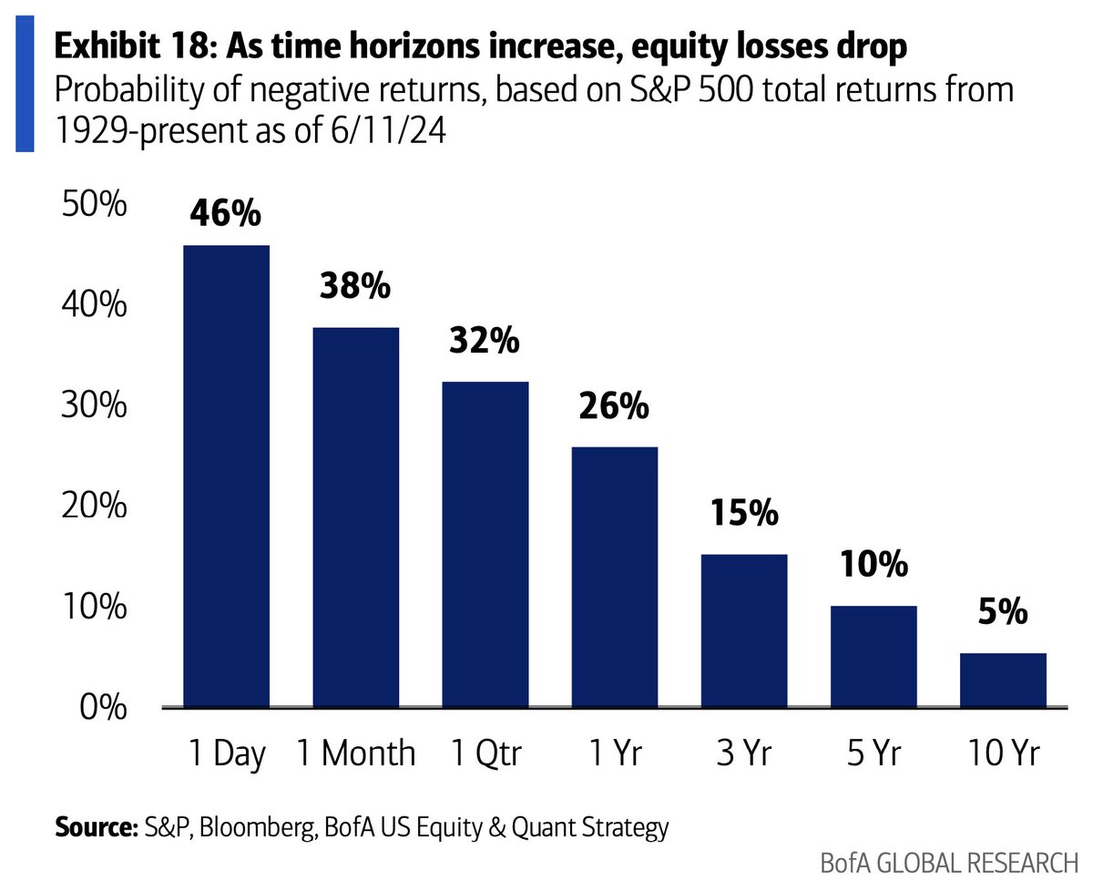 Probability of -ve Returns on S&P500 #chartoftheday (via @dailychartbook) As the time horizon increases, the probability of negative returns on the S&P500 drops precipitously, Bank of America analysis shows.