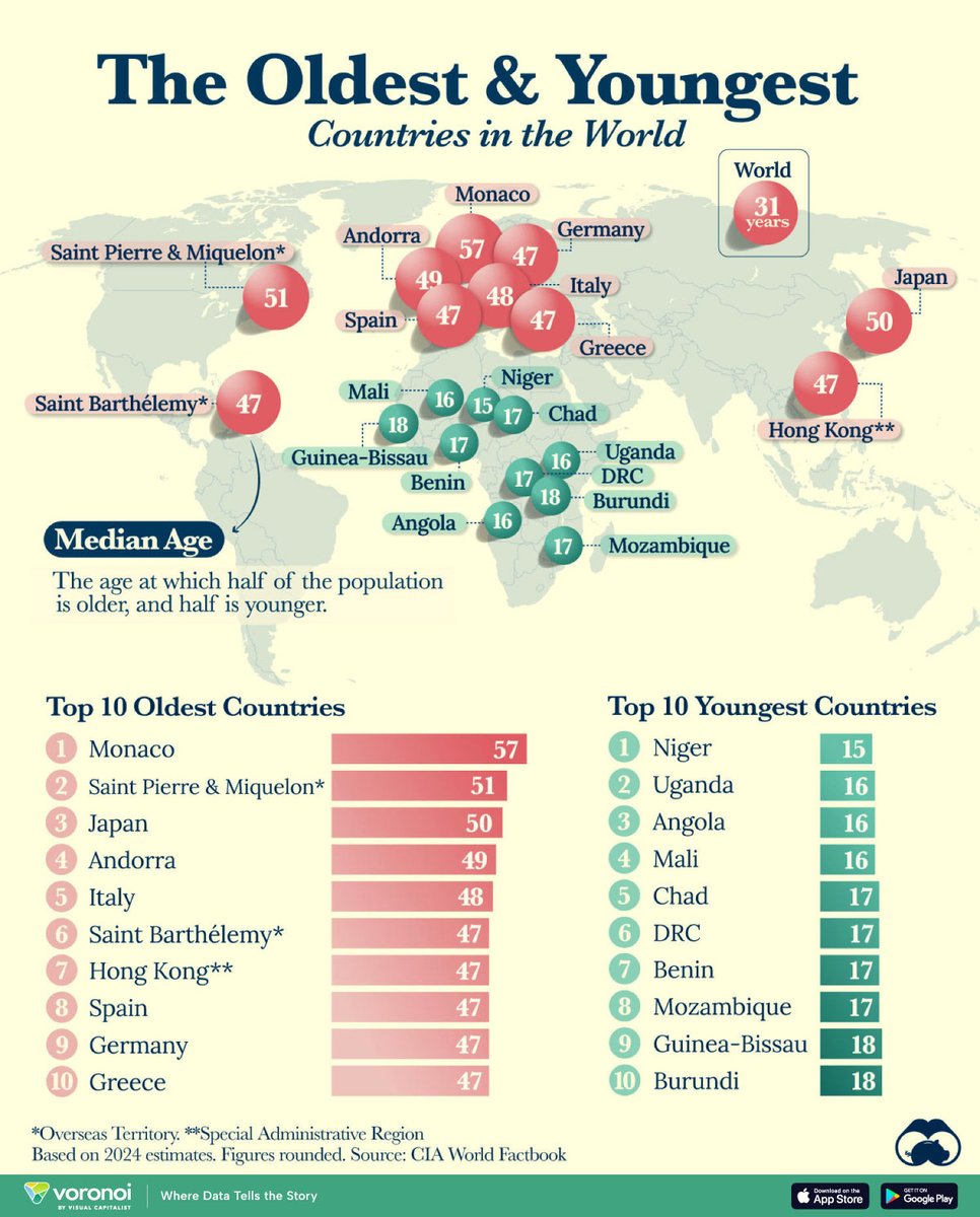 Oldest/Youngest Countries by Median Age #chartoftheday (via @VisualCap) Monaco, Japan and Andorra are the oldest countries in the world by median age, with all top ten youngest countries in Africa.