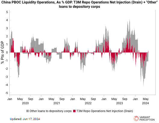 China PBOC Liquidity Operations #chartoftheday (via @VrntPerception) The PBOC’s balance sheet has been shrinking YTD and liquidity operations have been draining liquidity so far, data from Variant Perception shows.