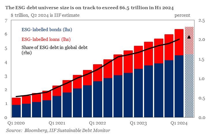 ESG Debt Growth #chartoftheday (via @jsblokland) Data from IIF Sustainable Debt Monitor shows the universe of ESG debt on track to exceed $6.5tn in 1H2024.