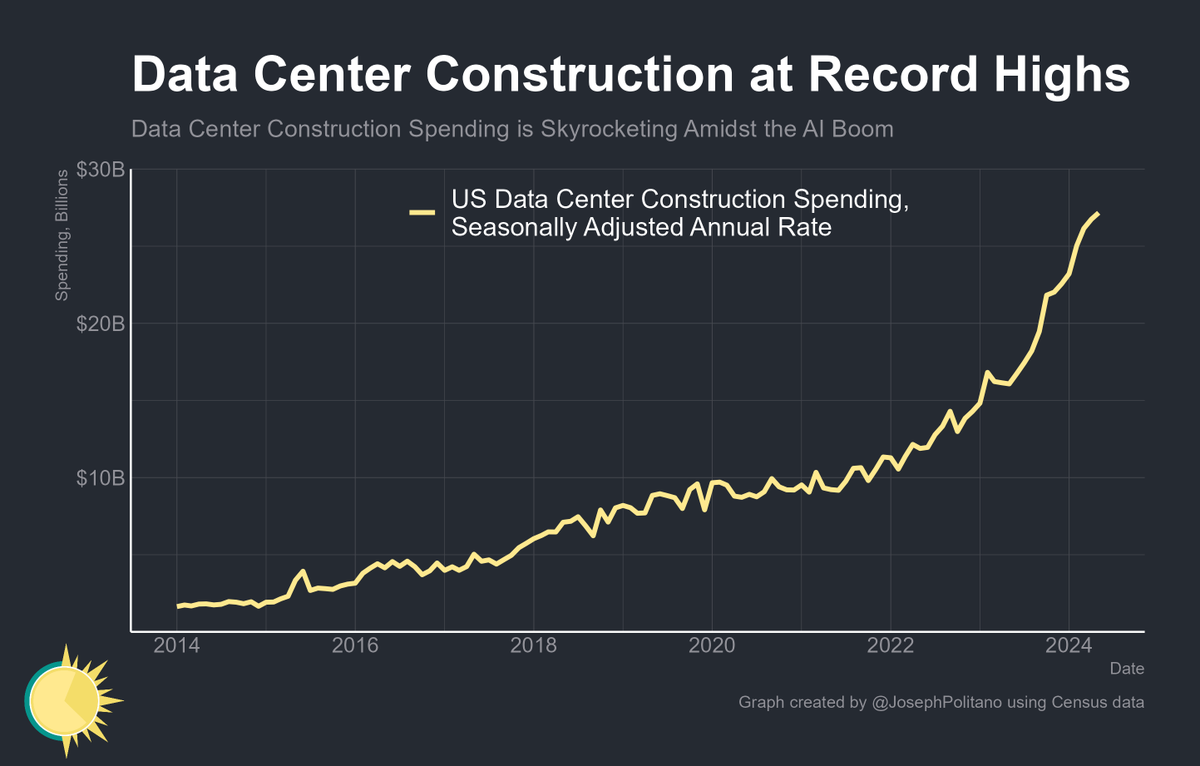 US Data Center Construction #chartoftheday (via @JosephPolitano) Census data shows American data center construction spend skyrocketing by ~60% since last May.