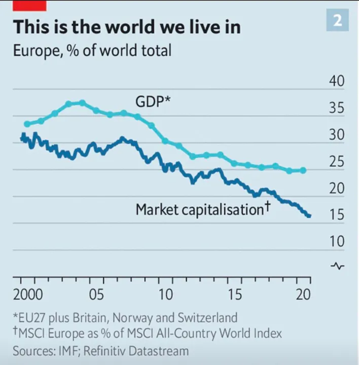 Europe: % of World Total #chartoftheday (via @jsblokland) Europe’s share of global market capitalization has dropped from ~30% in 2000 to ~15% in 2021, The Economist illustrates.