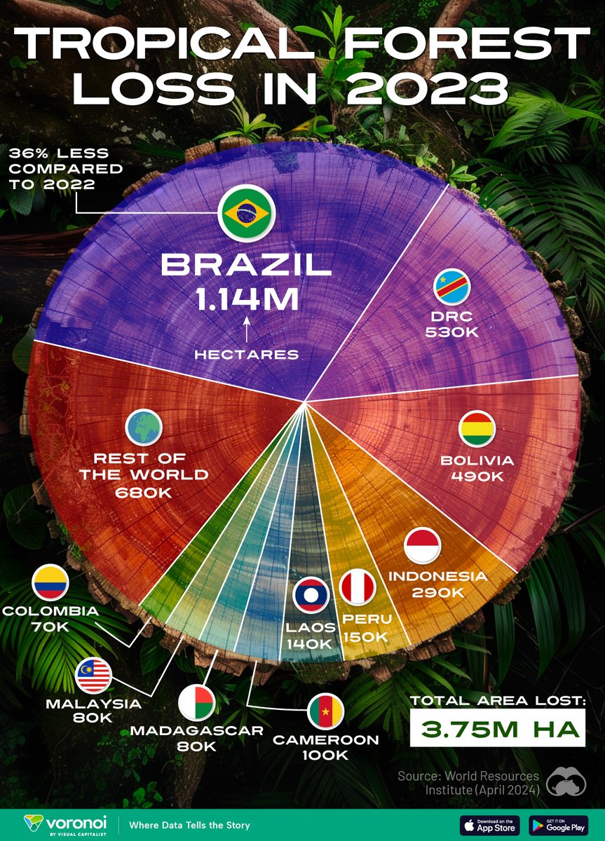 Tropical Forest Loss in 2023 #chartoftheday (via @VisualCap) Brazil, Democratic Republic of Congo and Bolivia led nations with the largest tropical forest loss in 2023, data from the World Resources Institute suggests.