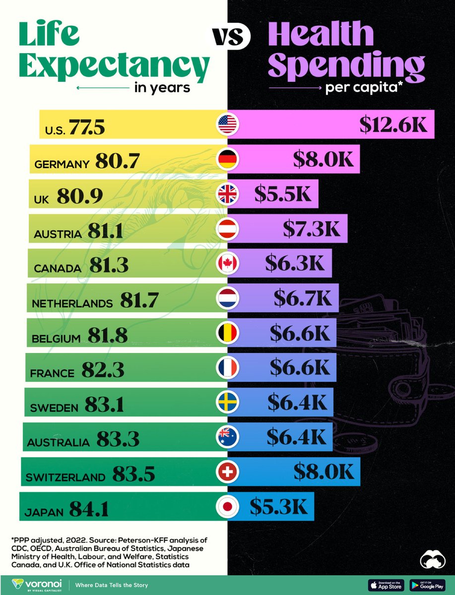 Life Expectancy vs Health Spend per Capita #chartoftheday (via @VisualCap) Japan stands out in an analysis of select developed countries when it comes to efficiency of health spending per capita versus the life expectancy of the population.
